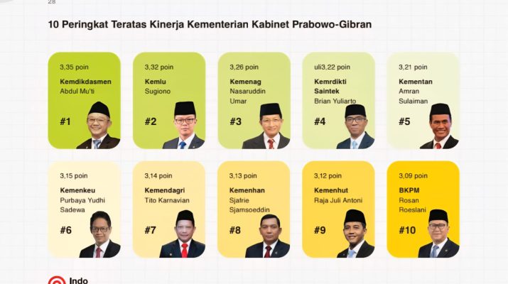 Melalui Evaluasi Kinerja 1 Tahun Kabinet Merah Putih, Kementerian Pendidikan Dasar dan Menengah (Kemendikdasmen) menempati peringkat pertama dengan nilai 3,35 poin berdasarkan hasil survei