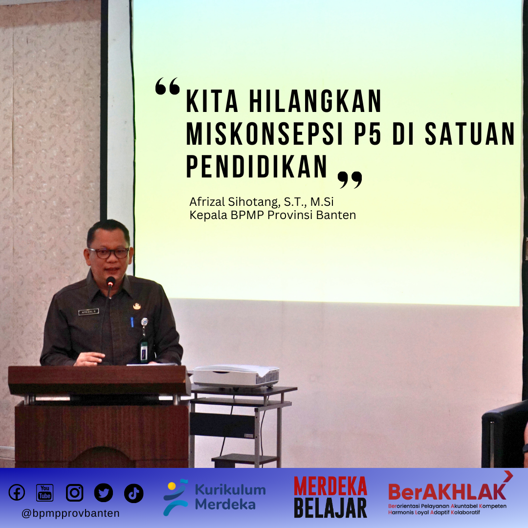 Kegiatan dilaksanakan pada tanggal 25 September 2023 di aula BPMP Provinsi Banten dihadiri oleh 50 peserta yang terdiri dari unsur pengawas dan kepala sekolah jenjang SD di wilayah Kota Cilegon, Kota Serang dan Kabupaten Tangerang. Kegiatan ini dibuka oleh Kepala BPMP Provinsi Banten bapak Afrizal Sihotang, S.T., M.Si. dalam pembukaannya bapak kepala menyampaikan pesan “Kita Hilangkan Miskonsepsi P5 di Satuan Pendidikan”.