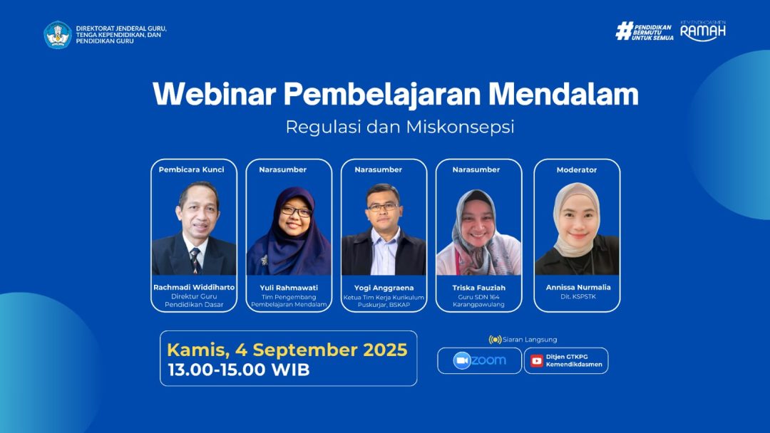 Namun, dalam praktiknya, masih ditemukan beberapa miskonsepsi terkait pembelajaran mendalam di kalangan guru, sehingga tujuan utamanya belum sepenuhnya tercapai. Untuk menjawab tantangan itu, Direktorat Jenderal Guru, Tenaga Kependidikan, dan Pendidikan Guru (GTKPG), menggelar Webinar Nasional Pembelajaran Mendalam bertajuk Regulasi dan Miskonsepsi.